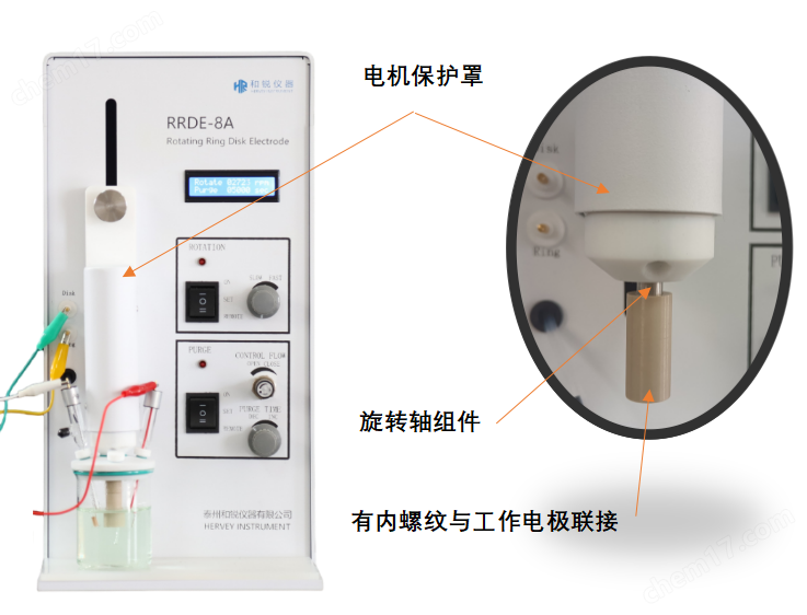 在拆装电极前,应先将RRDE-8A装置的电源关闭,各个电极(参比电极,对电极,环/盘电极)上所有电极与电位仪连接的引线应该先行拆除。然后沿逆时针方向拧松白色聚四氟乙烯板块上的亮色手紧螺丝,将马达电机和旋转轴组件整体向上移动至旋转工作电极位于电解池盖的上方,并拧紧聚四氟乙烯板块上的亮色手紧螺丝,固定好位置。接着按顺时针方向转动马达电机的旋转轴组件至180度左右的位置。工作电极是通过拧转连接在旋转轴组件上的。圆盘电极通过装在转轴先端的接触顶针与盘转轴接触传导电流。接触顶针嵌在内里,手碰触不到,避免了操作时误碰触的危险。小心地将电极从转轴上逆时针方向拧开,即可拆下工作电极。